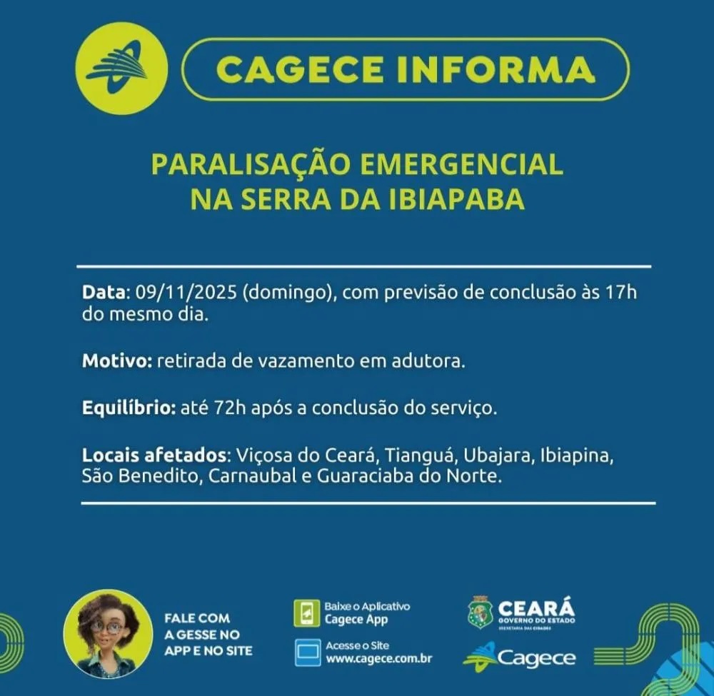 Sete cidades da Serra da Ibiapaba tiveram o abastecimento de água suspenso no domingo (9), conforme informou a Companhia de Água e Esgoto do Ceará (Cagece).A interrupção foi necessária para que equipes realizassem a retirada de um vazamento em uma adutora que atende a região.