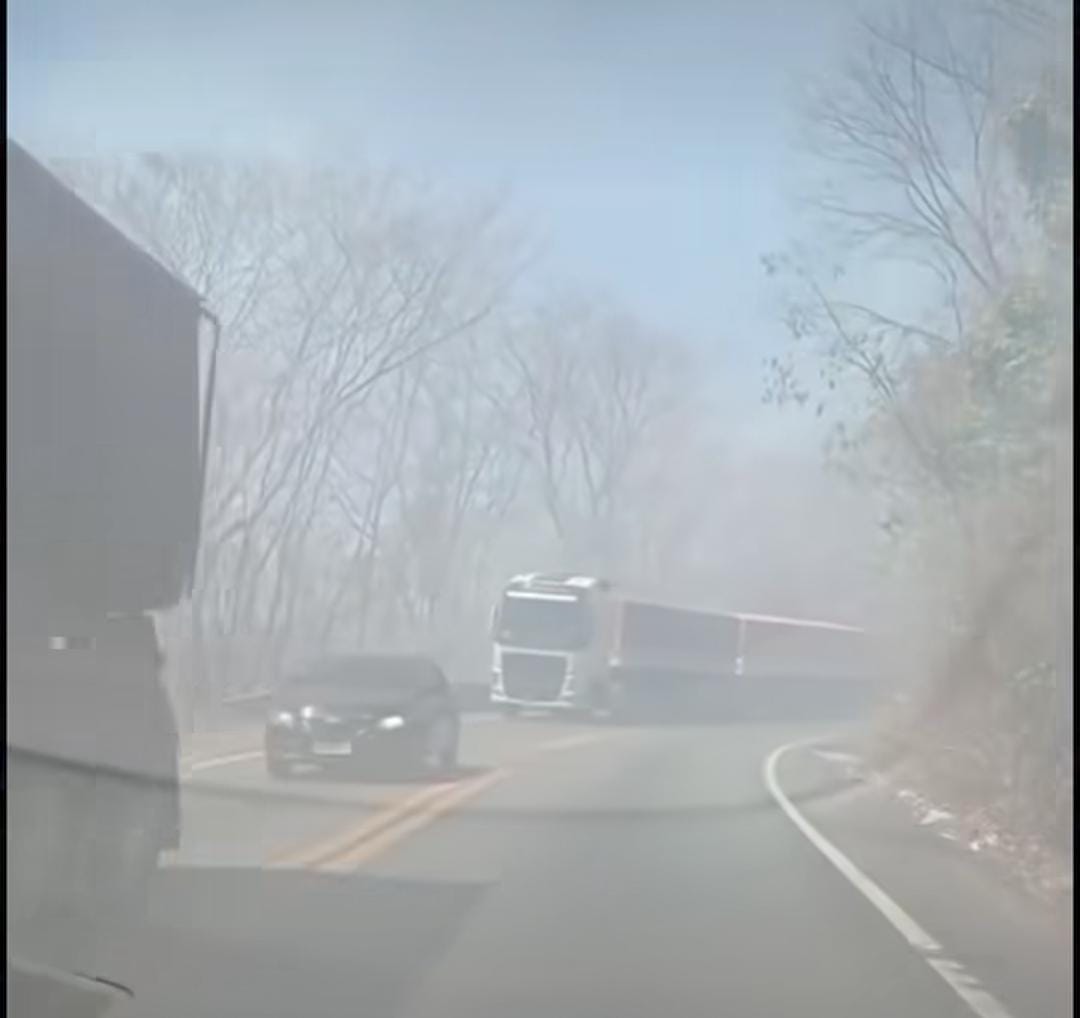 Uma grande quantidade de fumaça tomando a rodovia nas imediações do km 299, reduzindo a visibilidade e oferecendo risco aos condutores.