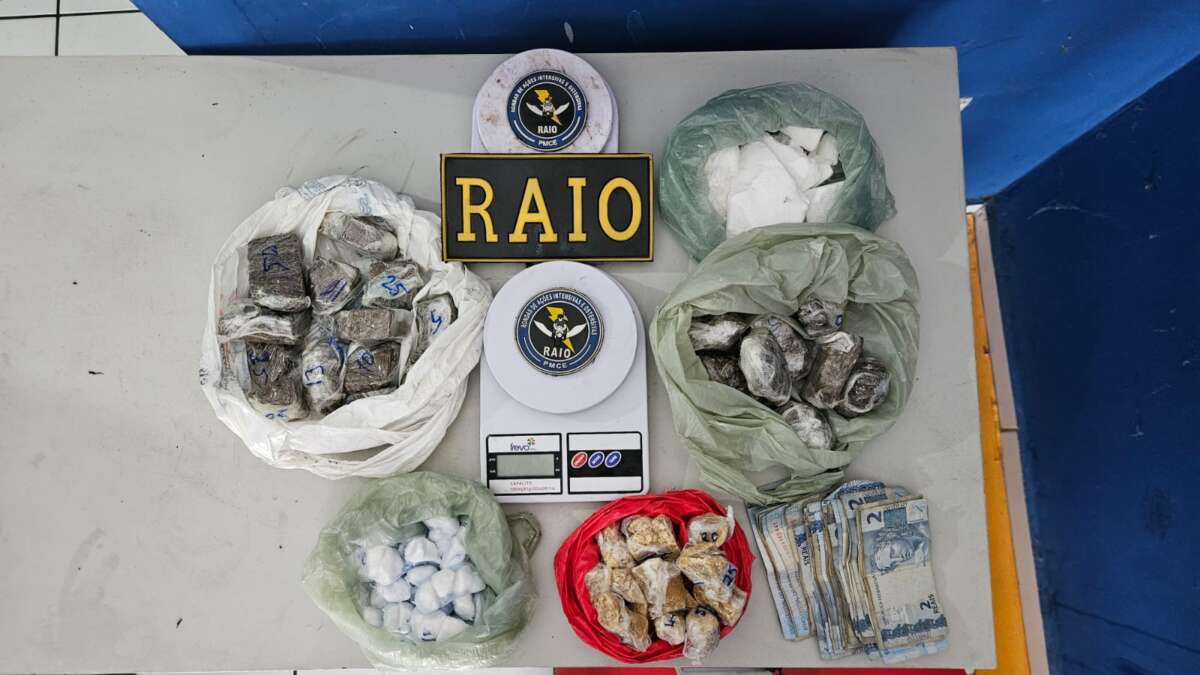 Os policiais militares do Comando de Policiamento de Rondas de Ações Intensivas e Ostensivas (CPRaio) receberam uma denúncia anônima, por volta das 12h, informando que um indivíduo escondendo drogas em um terreno baldio próximo a uma área de mata. Os raianos deram prosseguimento ao atendimento da ocorrência realizando as diligências. No local, foram encontradas 714 g de maconha, 711 g de cocaína e 340 g de crack e duas balanças de precisão.